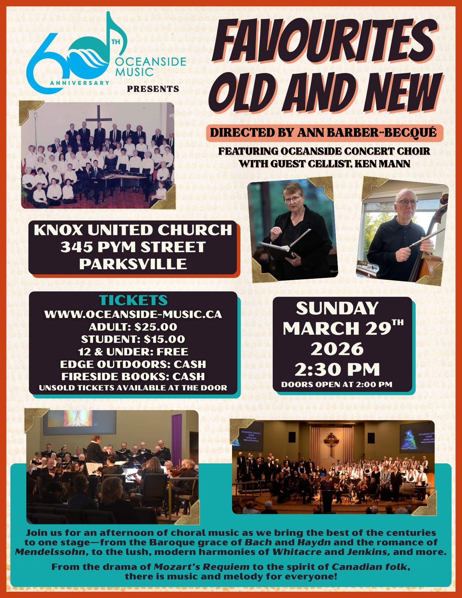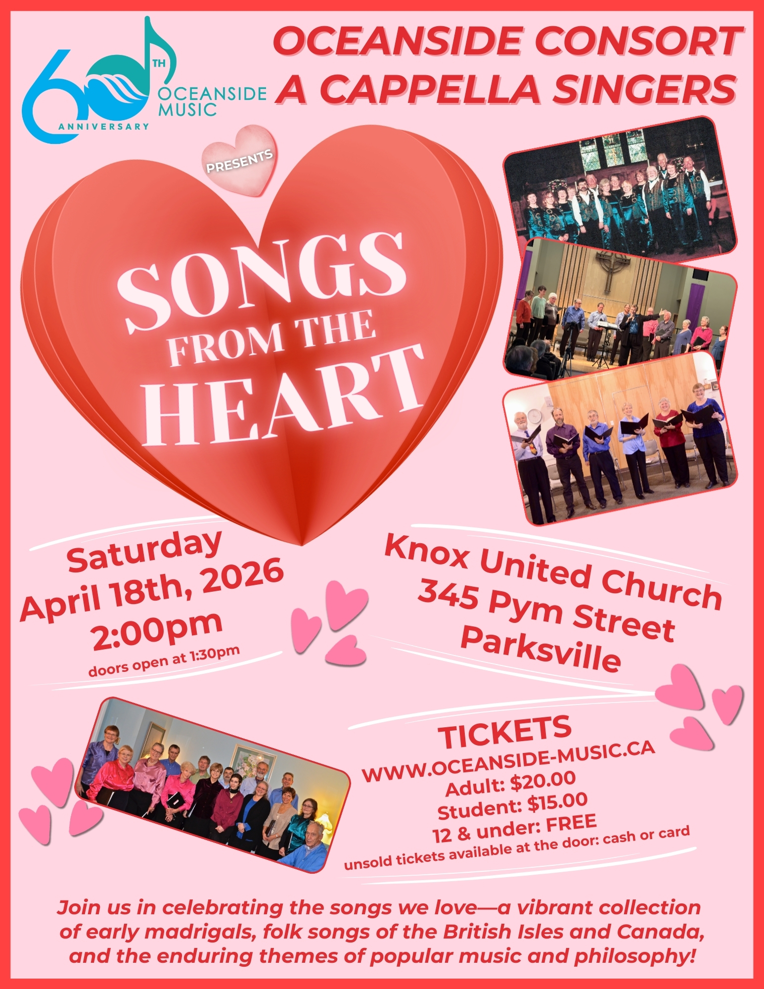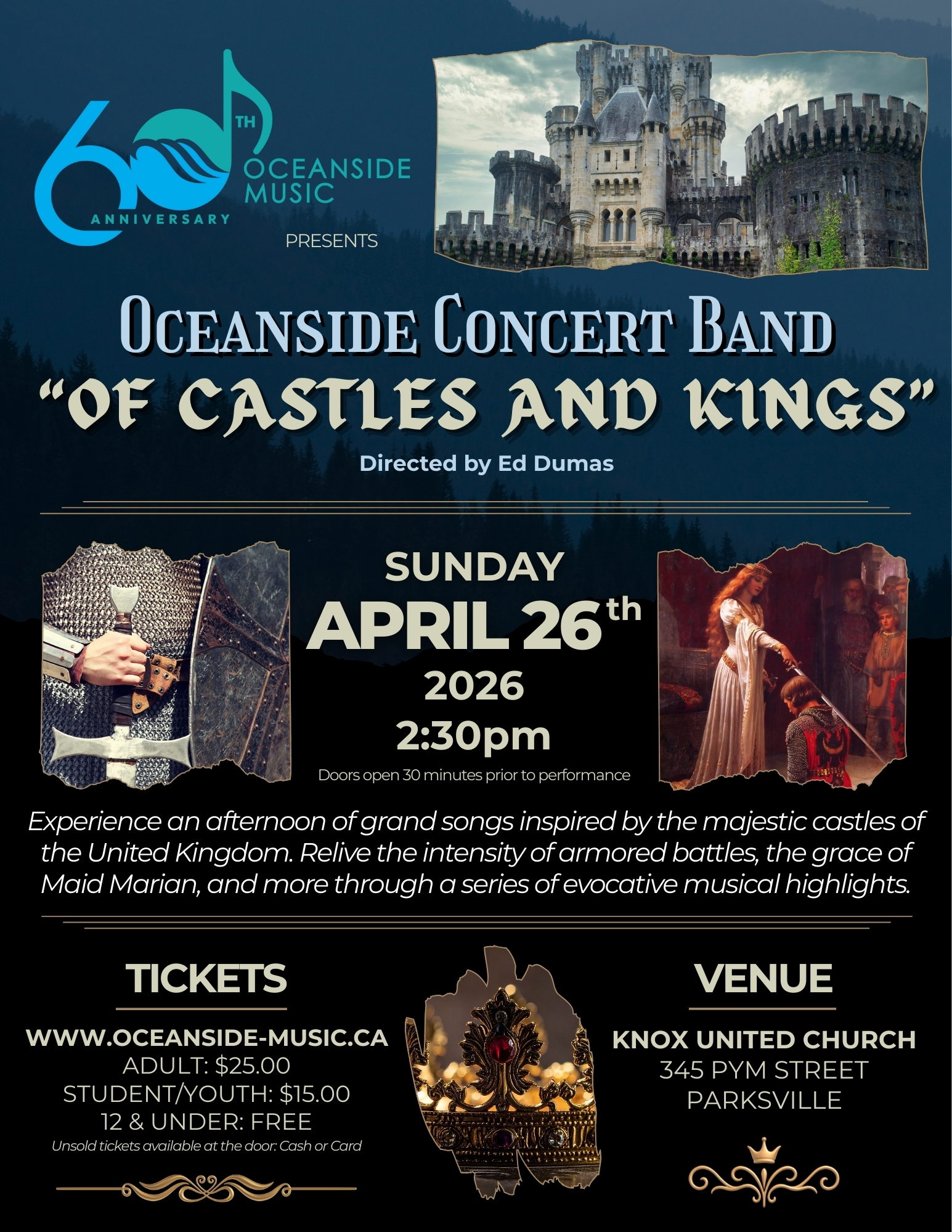 knox united church 345 Pym Street, Parksville, British Columbia, CanadaIn celebration of our 60th year, Oceanside Music Association is proud to present Oceanside Concert Band’s 2026 spring concert, Of Castles and Kings, directed by Musical Director, Ed Dumas. Suitable […]